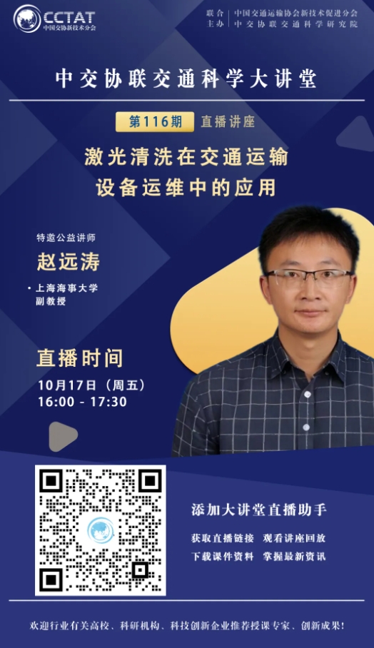 直播预告 | 中交协联交通科学大讲堂第117期:赵远涛《激光清洗在交通运输设备运维中的应用》